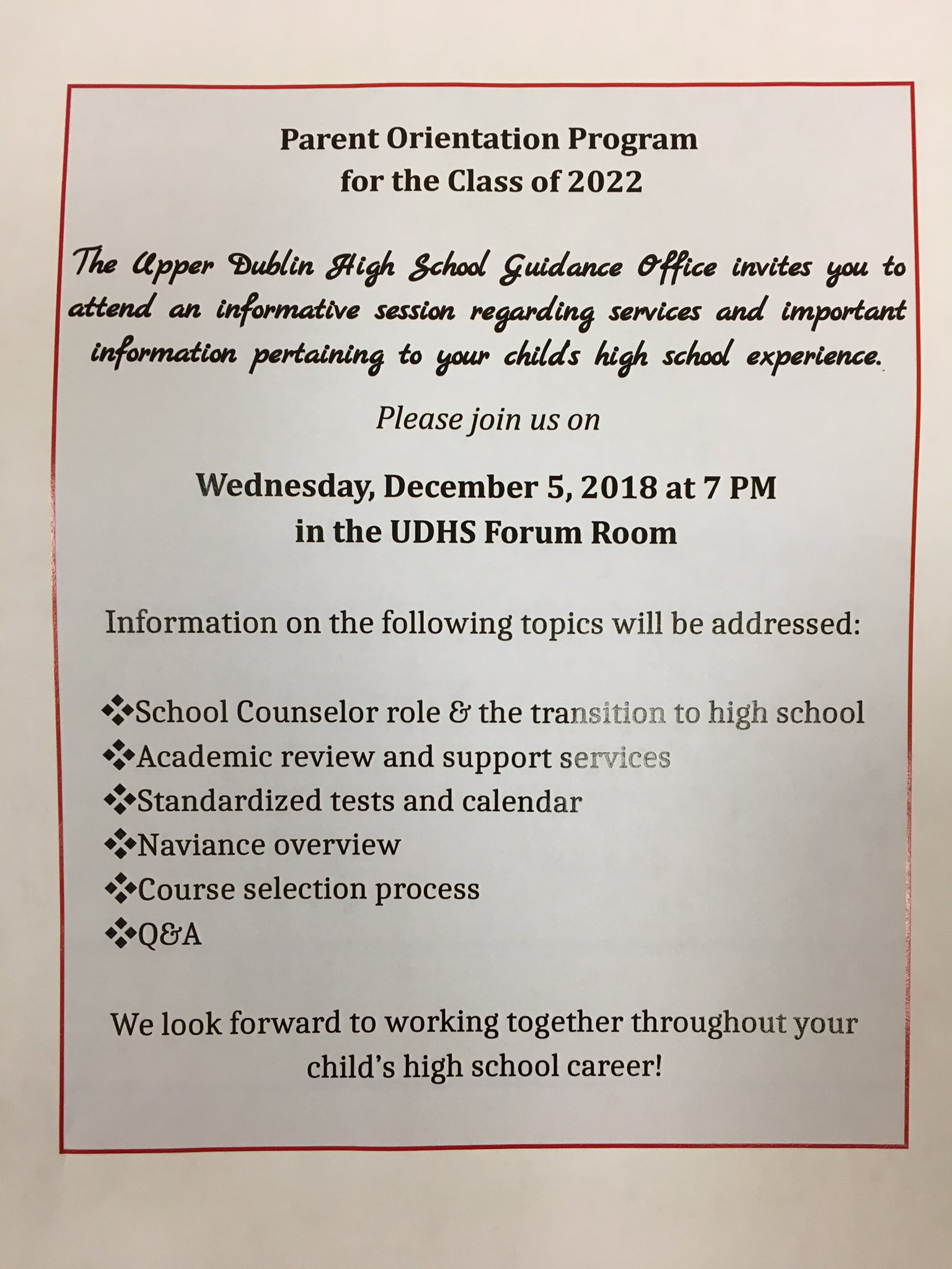 Udhs Guidance On Twitter Freshman Parents Please Join Us For A Parent Orientation Program For The Class Of 2022 Udhscardinals This Event Is Scheduled For Wed 12 5 At 7pm In The